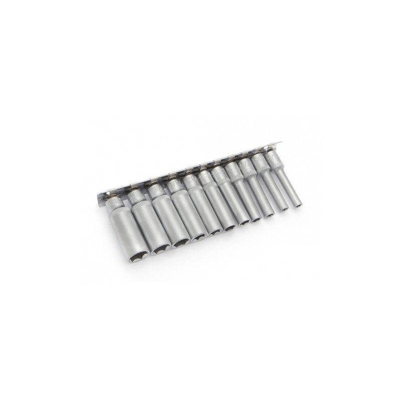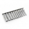 Сталь: CrV50Bv30 | 45—47 HRC | Хромирование Состав набора: — головки шестигранные удлинённые дюймовые: 5/32", 3/16", 7/32", 1/4", 9/32", 5/16", 11/32", 3/8", 7/16", 15/32", 1/2"; — планка для головок металлическая.Шестигранные торцевые головки «Дело Техники» изготовлены из хромованадиевой стали методом холодной штамповки с последующей термообработкой. Торцевые головки закалены, защищены от коррозии хромированием. Не боятся высоких и длительных нагрузок.Шестигранный профиль является наилучшим с точки зрения приложения нагрузок к классическому шестигранному крепежу. Удлинённая форма торцевой головки позволяет работать с крепежом на относительно высоких шпильках или с резьбовыми деталями глубокой посадки.Специальная рифлёная накатка на основании торцевой головки улучшает сцепные характеристики и исключает проскальзывание в руках.